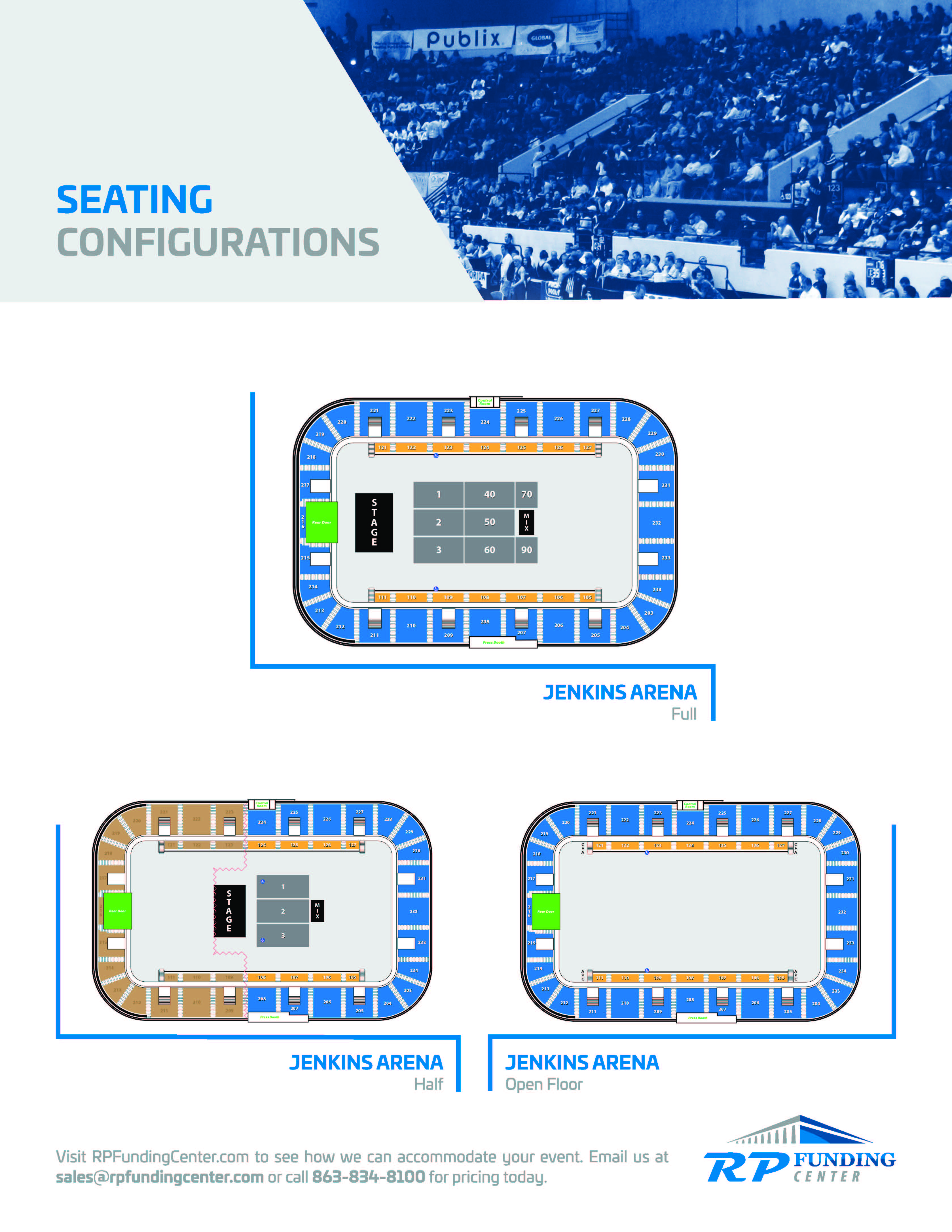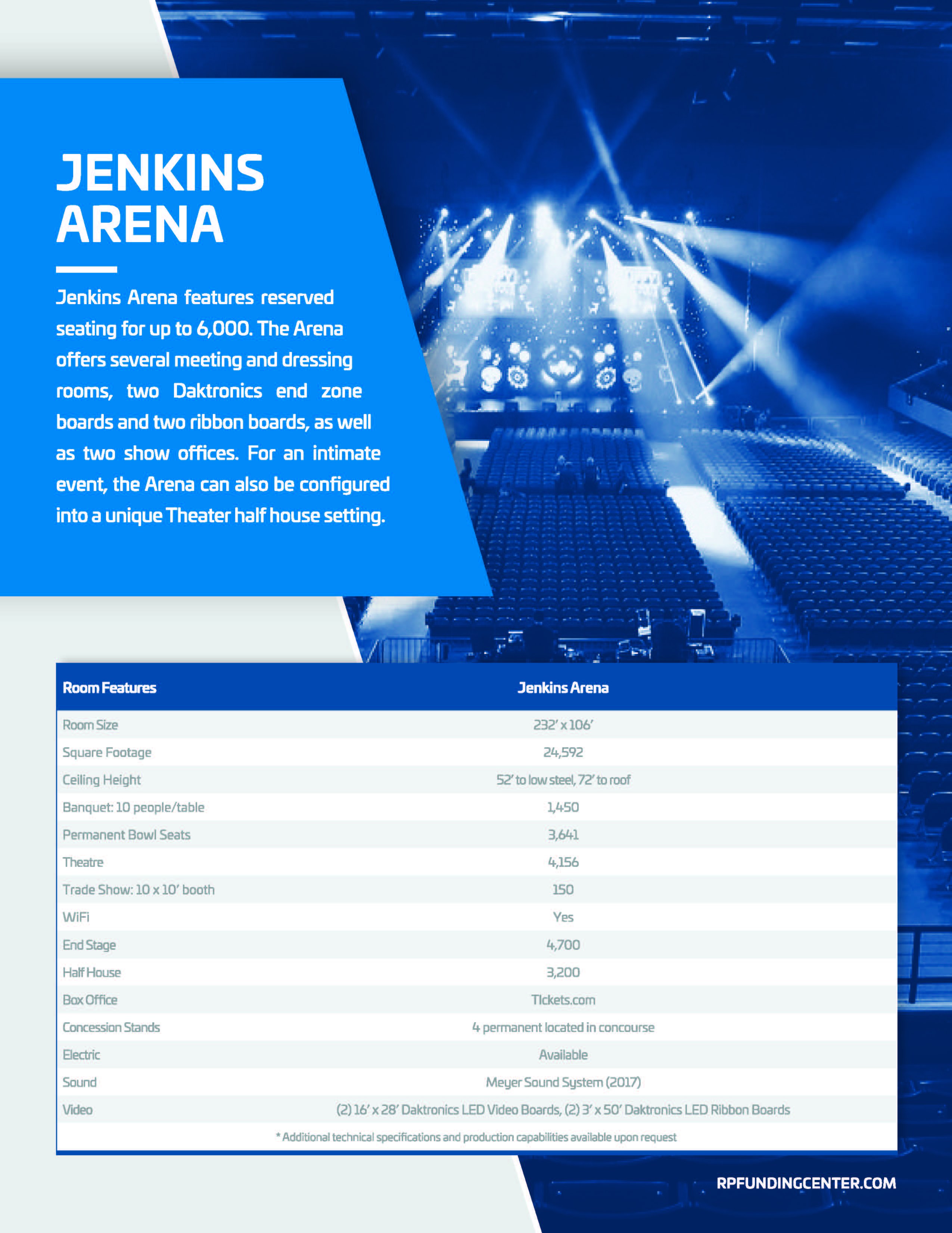 The arena offers several meeting and dressing rooms along with two show offices. For a more intimate event, the arena can also be configured into our “arenatorium” half-house setting.